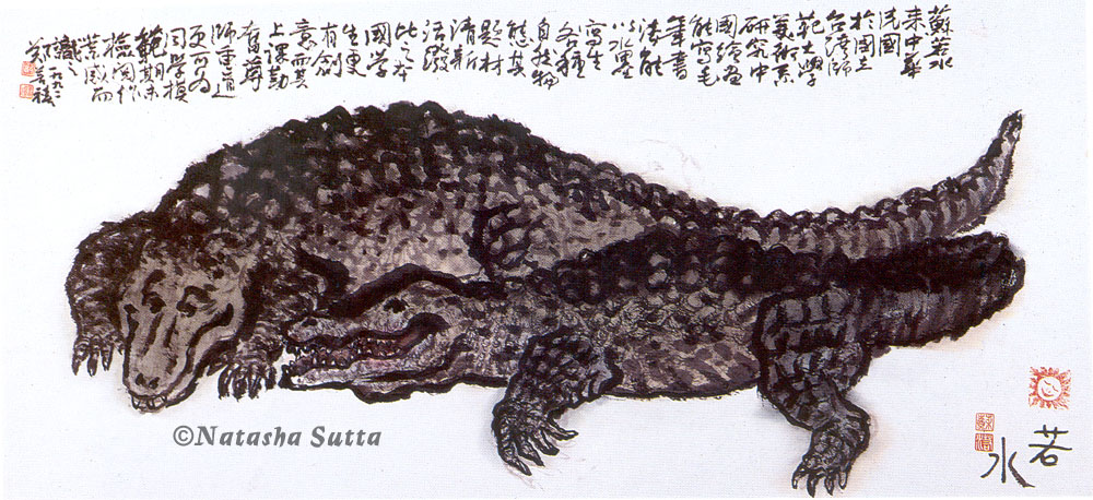 At one of my visits to the zoo, I painted two crocodiles, and later my teacher Cheng Shan-Hsi wrote some words on top of the painting.